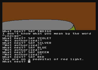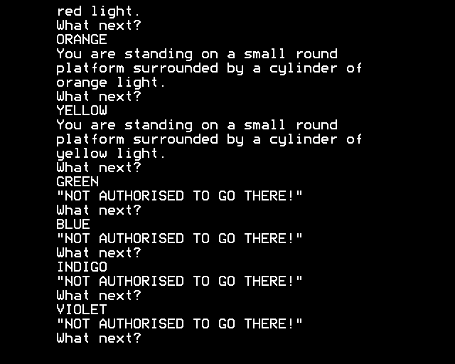 I finally realized (by testing it at back at the ship) the serum is simply intended as a treasure and we can’t use it. I admit I was looking forward to some even-more-terrible ending message by testing out the teleport-your-molecules device whilst immortal, but alas the technical requirements of this game remain extreme (it uses 12k rather than 8k, at least) and I don’t think the authors would have wanted to custom handle that.