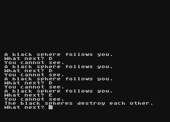CLOSE EYES, shockingly, works to get through (I can’t tell you how many times reference to a body part might help with a puzzle but it isn’t allowed!) Unfortunately, there’s a black sphere inside that will start following and then envelop you after enough turns. There’s a second black sphere in a different room and I tried to get them together to be friends but my timing must be off.