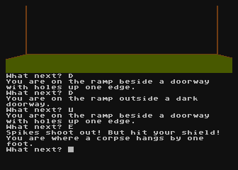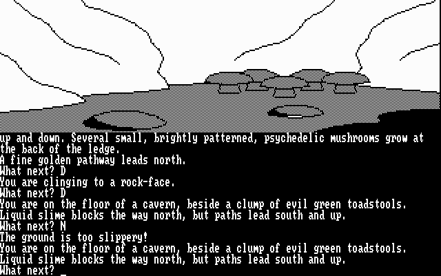 As you follow the dwarf up the steps, there’s a sound of a boulder bouncing from above (a similar trap was in Adventure Quest); as you keep falling you get into a “protected gully” in the nick of time.