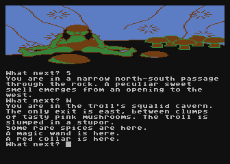 I incidentally don’t know yet if there’s an equivalent to the golden eggs from Crowther/Woods that I can get back from the troll; I just picked one to toss away at the moment (the coins) to keep exploring.