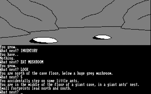 Down one path you can find some more mushrooms where eating them makes you small (you drop your inventory). Then you can head north into an area with “giant ants”, and yet farther north again to some more mushrooms. Eat the second set of mushrooms and you grow back to being big, but the problem is the ants are now blocking you.