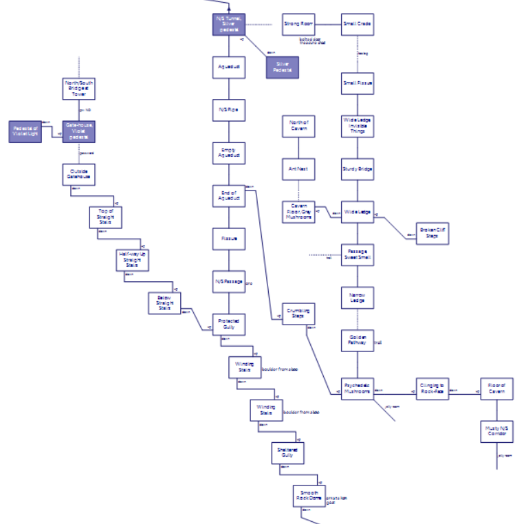 In Adventure Quest the very first biome after the start was a desert with a sandworm puzzle where a player will generally map it out first while being harassed by the sand worm, and only later reach the insight that it was being attracted to the sound of your movement (so stopping would reduce the danger); this represents a “large-scale” puzzle over many rooms. The swimming sections involving keeping track of your breath had me breaking out the paint program (well, vector software) in order to count steps. I had to think holistically about the entire route and plan my object placements accordingly.