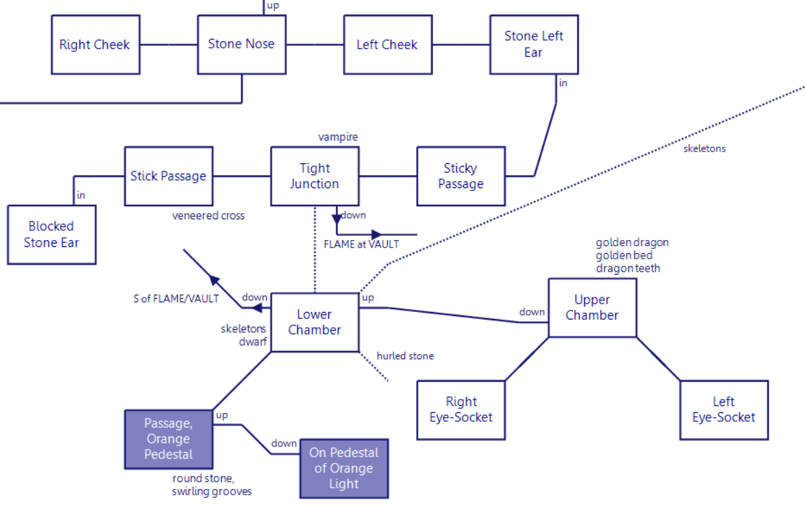Dungeon Adventure is (so far) more compact. It has (again, so far) many more single-room puzzles than Adventure Quest, and gives items and the things they solve not far apart. Even with things a little bit spread out the games seems more focused on small “riddles” more than large-scale coordination. (I described Adventure Quest as approaching the feeling of a time travel game where you keep track of space rather than time.) It also has everything (yet again, so far) packed in, and nothing even resembling a maze or the wild interconnections of Colossal Adventure.