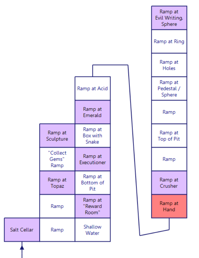 Arriving here, as I already mentioned, is a one-way trip. It almost feels like a self-contained mini-adventure, except there’s no reason that outside items can’t be used to solve puzzles (except I haven’t managed to do that yet). You get trapped on two very very tall ramps, and a variety of rooms, many of which kill you. (This feels like prequel to the movie Cube but with an even lower budget.) Within this area you can find gems like rhinestones and diamonds and there’s a door that asks you to “collect 9 or 10 gems”. This hints at perhaps we need the gems to be able to get out. Gem rooms light purple: