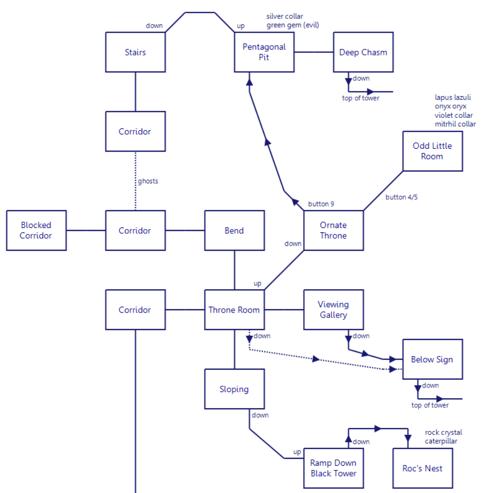 I finally seem to be out of rooms to map, so I’ll have to start testing out theories. Since the inventory limit was increased you can theoretically tote every item around in the entire game with you, but it means logistics are still a pain as you have to drop the case, go in to the right room, take what you need (while dropping items as well), and come back out. I’m up to 172 rooms total on my map, and Level 9 tended to use a max limit of 200 at this time, so I think the only substantial place left is the endgame section (past the black tower, maybe?)