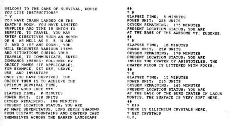 This is, as far as I can find, the only game or article of any kind by Stewart F. Rush. It comes from a BASIC type-in listing printed in the January 1982 edition of Creative Computing (the same one that had that rollercoaster game that used a laserdisc); it is for computers that use a S-100 bus (like the North Star Horizon) but includes conversion instructions for TRS-80 and Apple II. It was later re-printed in a slightly larger form in David Ahl’s Big Computer Games (1984), which gives the lines: