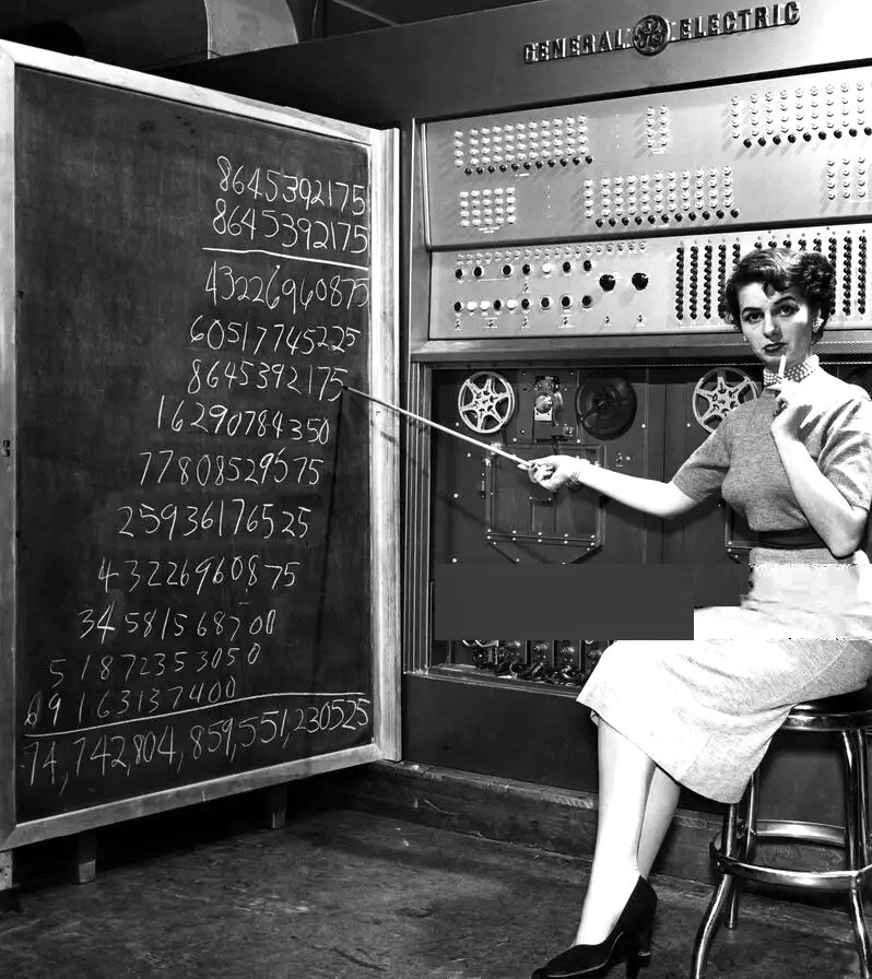 When the General Electric OARAC computer started working, they invited 6 humans in a computation contest, trying to find the square of 8,645,392,175 by hand vs. the computer. The computer time was 0.004 seconds, the average human time was 8 minutes. All six humans failed to get the correct answer. Connie Hodgson of Syracuse, New York, is shown here pointing at where she forgot to carry the one.