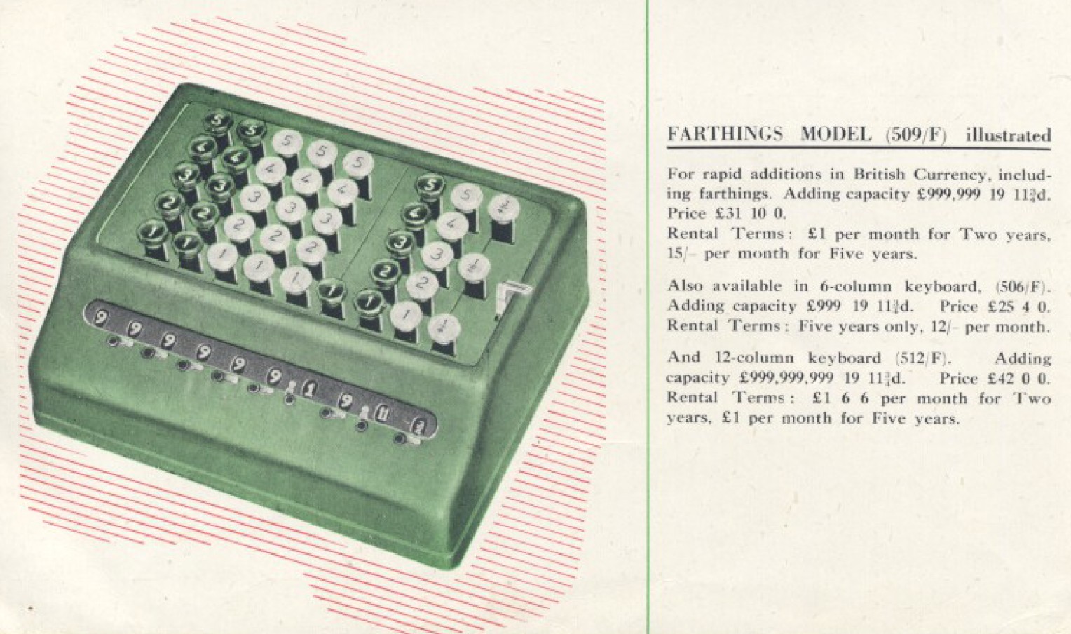 During WW2 they made a subsidiary brand, Sumlock, specifically for the manufacture of calculating machines. A 1943 ad highlighted the “more-work-less-staff-problem” being faced during the war. After the war they pushed even harder into the calculating space.