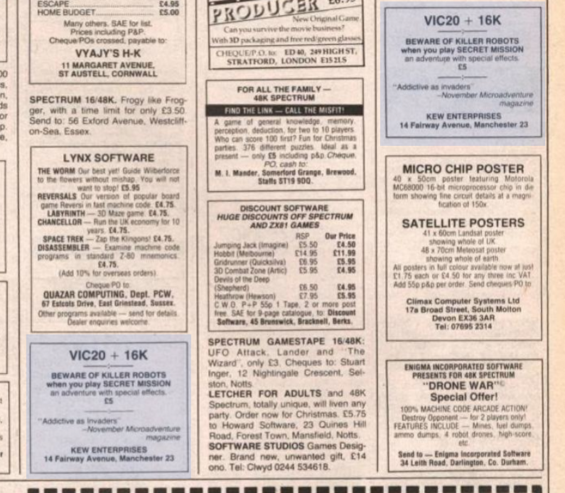 The Puzzle Pack games were eventually republished for MSX and Plus/4 under the name Can of Worms, with a few modifications, and Kew Enterprises still mentioned on the game’s screens. What’s puzzling is after this game was picked up Kew Enterprises started advertising their game Secret Mission on their own, using magazine classified ads.