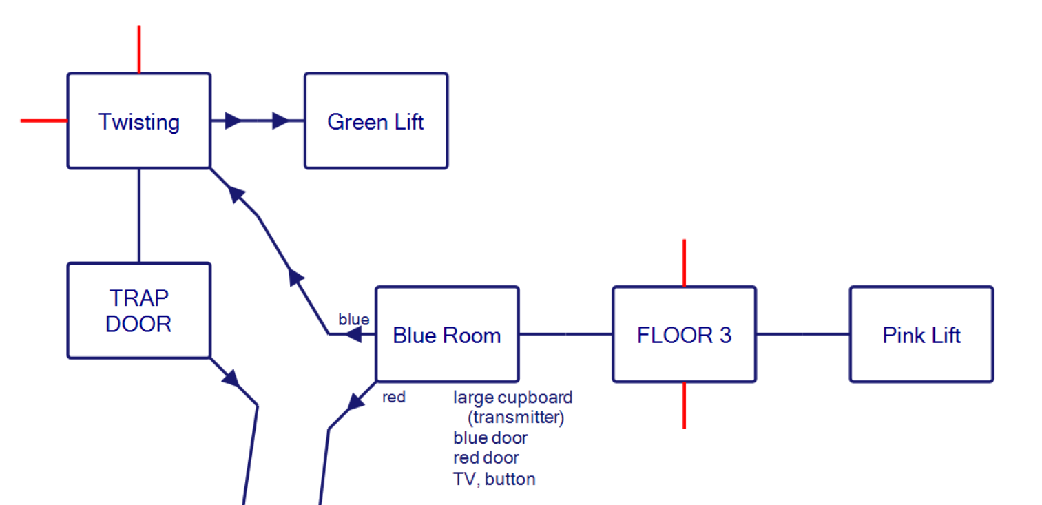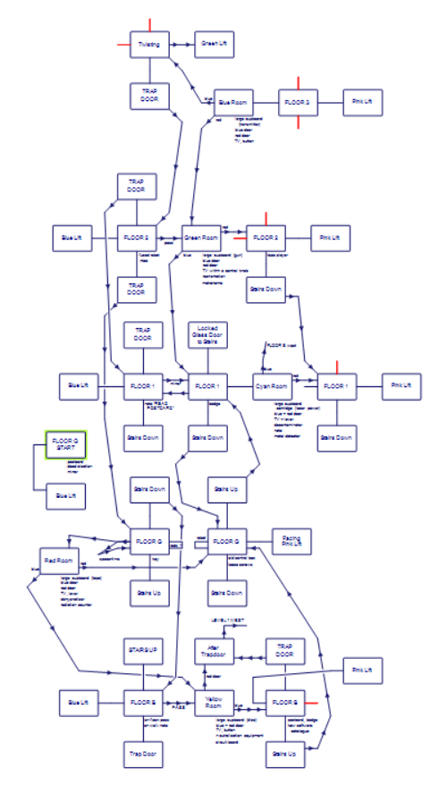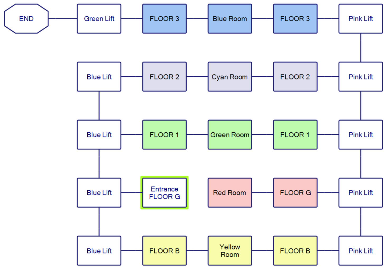 The complex is a tower with multiple lifts: a blue lift on the west side, a pink lift on the east side, and a green lift which will take the player to the end. A general map, although this is without the one-way arrows and other complications: