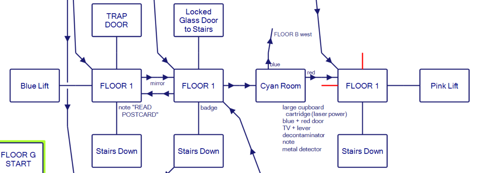 So on floor 1, you start in a regular corridor with the note READ POSTCARD and then going north falls down a trap door (which drops two levels) and going south leads to some stairs which get used automatically (dropping down one level). Try to go east and you are blocked by a laser beam unless you are carrying the mirror from the start.