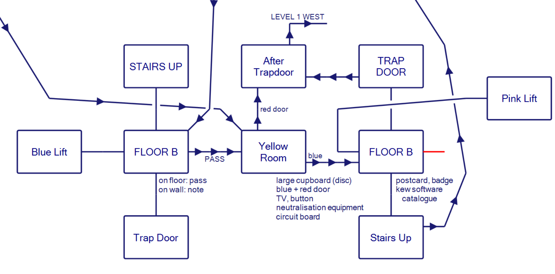 The room includes a “pass” which is needed to unblock passage east. (It also gets used equivalently on Floor 2, so you can’t just assume an object can be discarded right after use.) There you can find a yellow room.