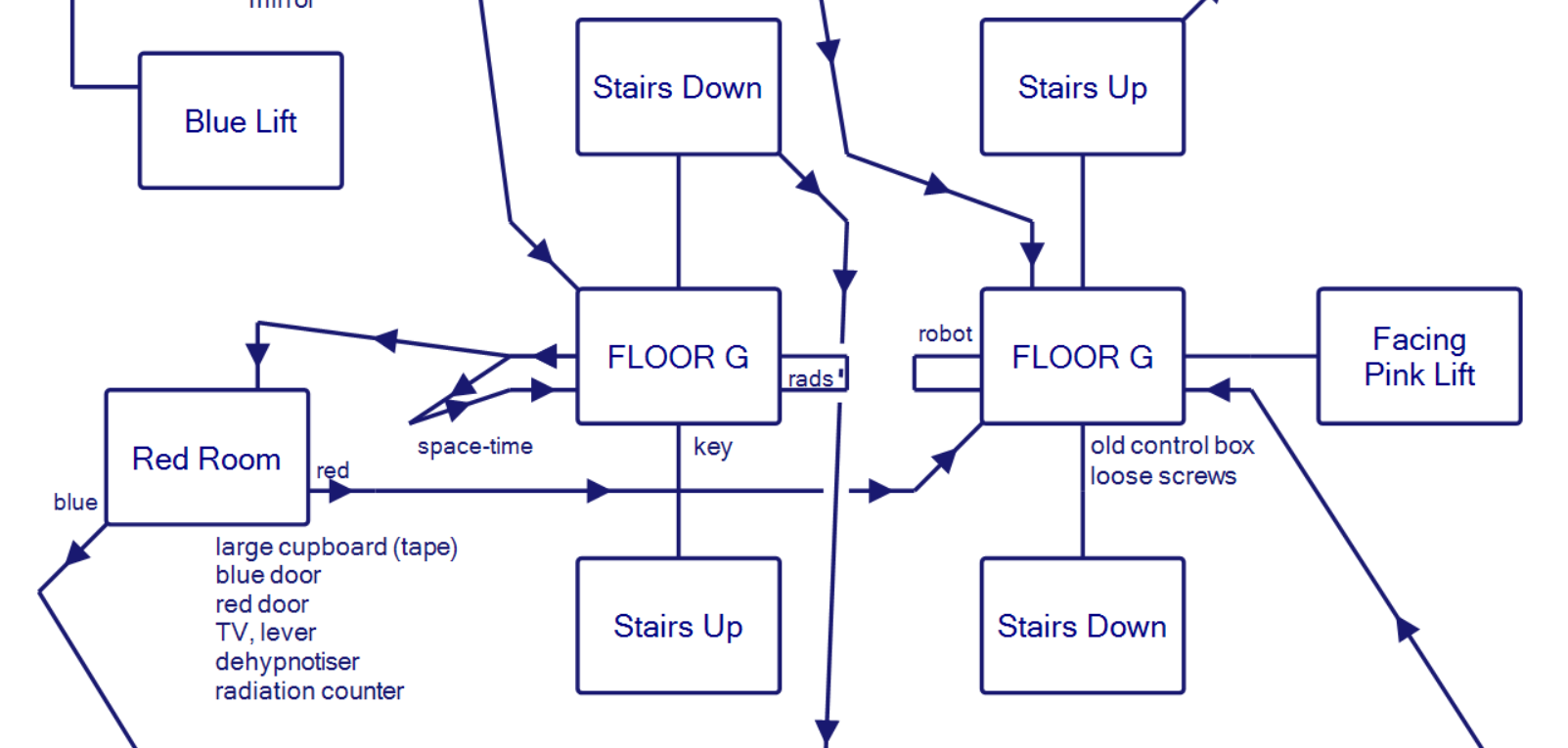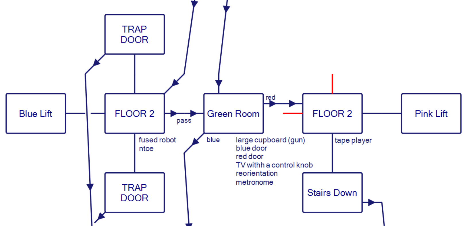 I haven’t been talking about them, but the red exits are dead ends like “a locked door” or “a killer robot lurks”. In both cases you might think there’s some way to handle them (like that deadly key) but they really are just dead ends.