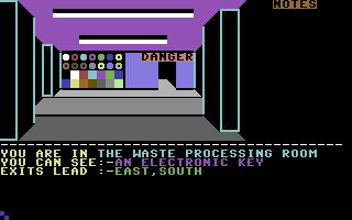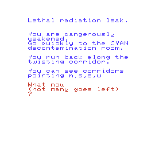 I had immense trouble here; any keypress I did seemed to cause death. I tried typing LOAD. I tried making sure I had the charger pack (maybe that would help with the hand cannon). I tried going through every letter on my keyboard and reloading with a save game state. I started to suspect maybe I was hitting a bug. I was not, but it would not be until much later that I would resolve this issue; since it appears at random I was able to juggle just avoiding having them show altogether. This isn’t silly for this game — my winning run ended up skipping quite a lot — for example, that key I mentioned, which requires decontamination to survive even being picked up? I tried it on the glass locked door, no dice; I tried it on other exits which also mention a locked door, and nothing happened there either. You don’t need the key at all; it is a red herring. Hence, I figured perhaps the robot fights could be evaded in a similar way.