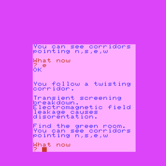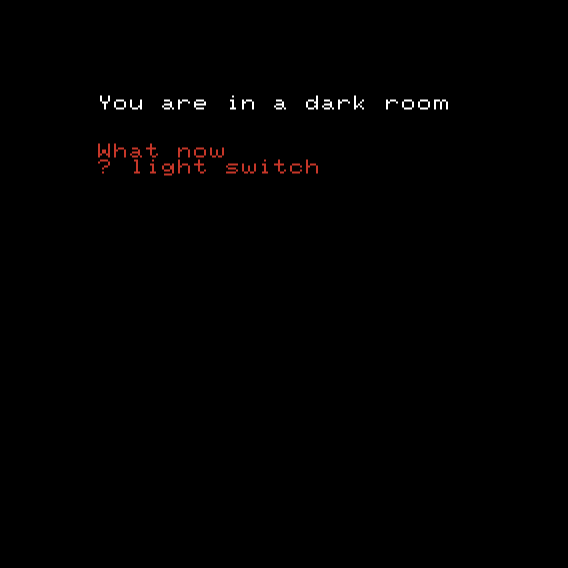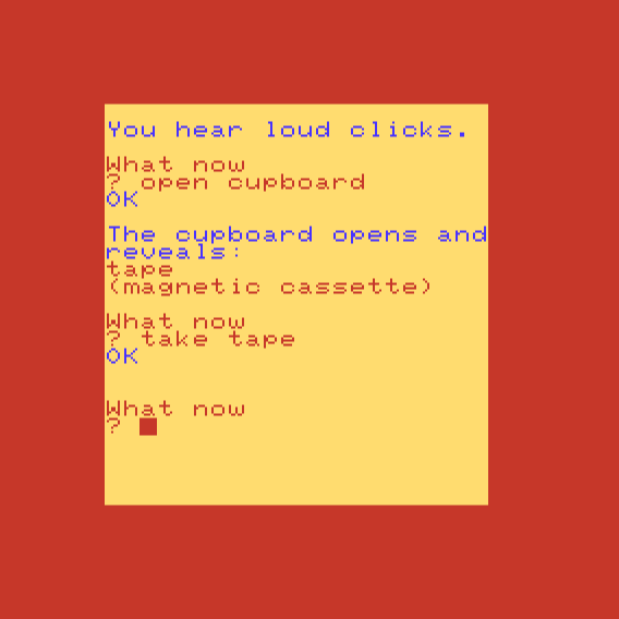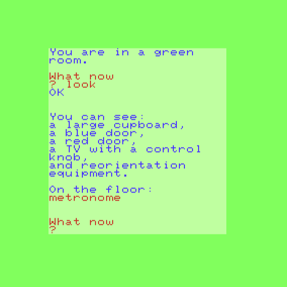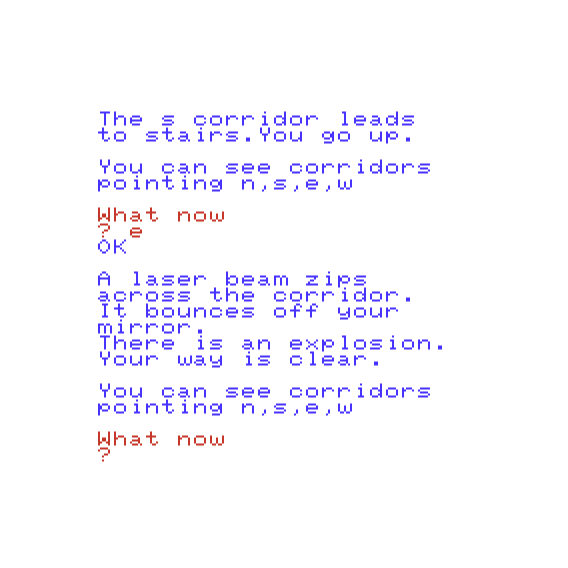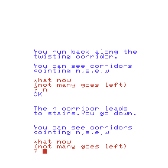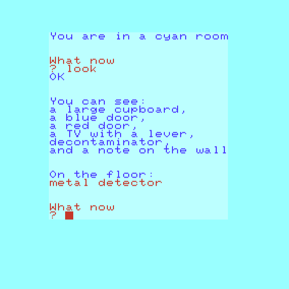 Here’s the actual code in question. While there’s technically a parser and world model most aspects are being “faked” so to speak; a Scott Adams game would have each item implemented as an object in code whereas these are just text strings, with conditionals for customizing the various rooms.