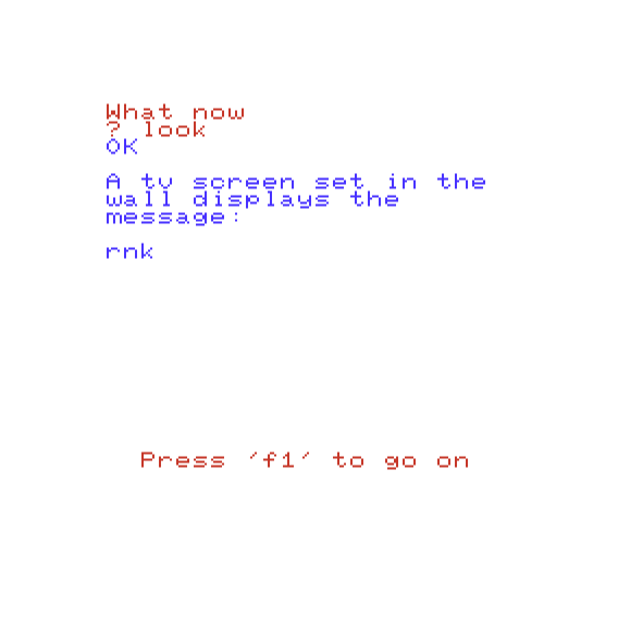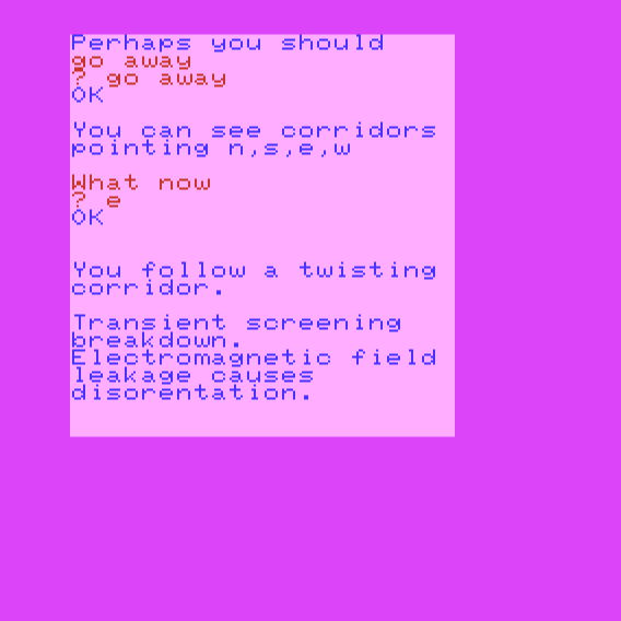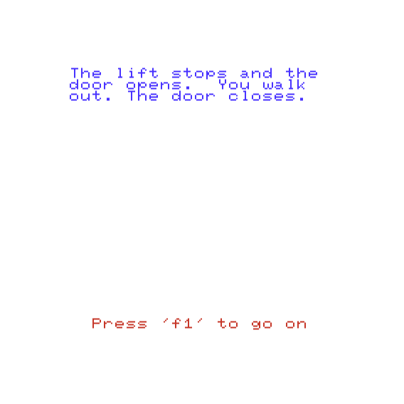 From last time: our protagonist had entered a room with a “blue lift” available and a postcard, mirror, and dead dog in the room. To see these things in the game you need to LOOK; typing LOOK then prompts (in some rooms) if you want to use a computer terminal. Using the terminal gives you what floor you’re on, although it can also cause a funky visual effect.