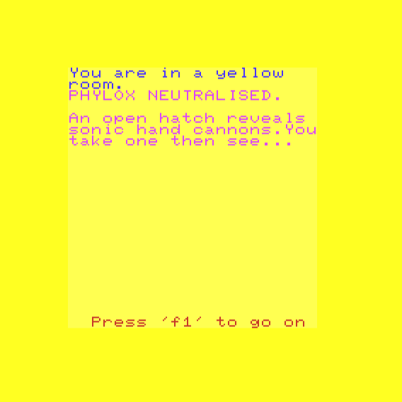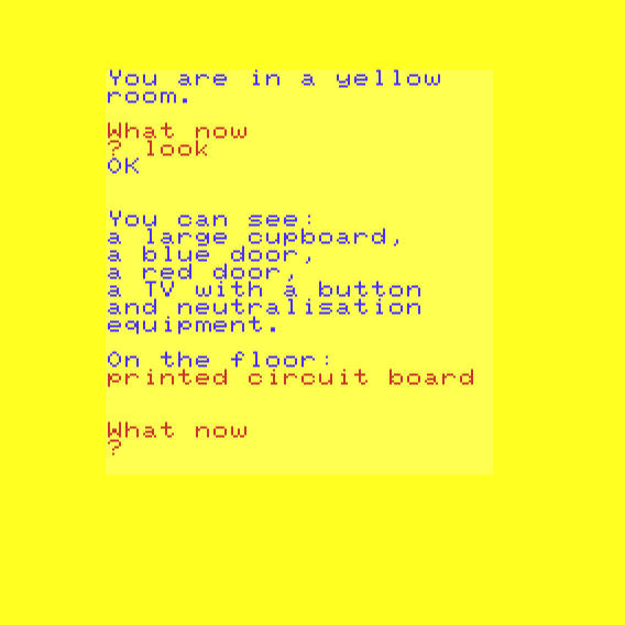 All of that material is completely optional. In fact, other than the pass at the start, you don’t need to go into the basement at all. The yellow room has a circuit board on the floor and a disc in the cupboard, and both seem like they would be useful defeating a rogue computer, but they are absolute red herrings. (I do want to emphasize how much easier the game is with me telling you this kind of thing; imagine you’re juggling an item limit of 3 this whole time and trying to pick up things like the disc you are sure are useful, while simultaneously getting dropped into trap doors for arbitrary reasons and getting attacked by robots that you can’t defeat.)