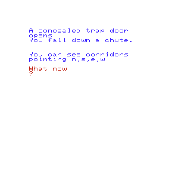 One other item of note is that the basement is essentially the bottom floor (there’s a special floor at the end of the game although it’s unclear if it’s “beneath” or “sideways”). This means if you go down farther, you will get dropped into a special area. For example, you might wander into a room with a trap door, or you might push the wrong button at the color room puzzle (trap door) or you might even spend too many turns in a room trying to figure out the syntax for something (trap door, just at random it seems after X turns).