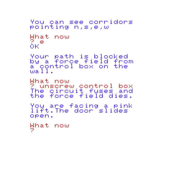 The east side (which you can reach going down stairs right where the mirror was used and we found the badge) has an “old control box” and some “screws”. If you try to go east you’ll get blocked by a force field. With the screwdriver from the start in hand you can UNSCREW BOX to get the forcefield down; the really wonky part is this doesn’t work until you’ve gotten stopped by the force field.