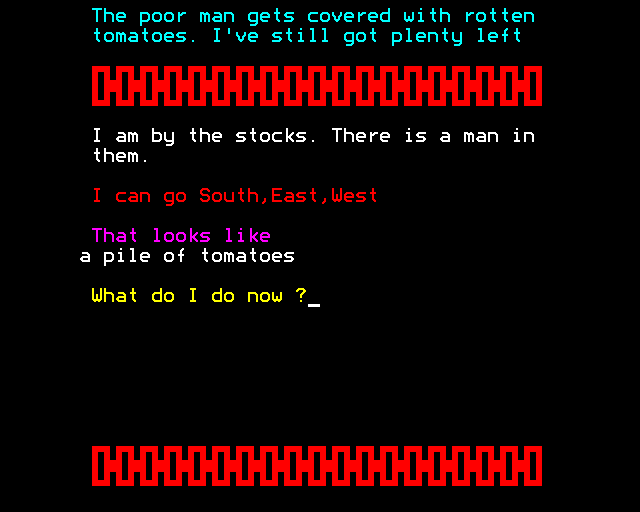 You can THROW TOMATOES (as the screen shows me doing) but FREE MAN and RELEASE MAN are right out. Maybe this scene is here to be funny? Just south of here is a “hand-operated lift” with a “rope with a hook” inside but no apparent way to operate the lift.