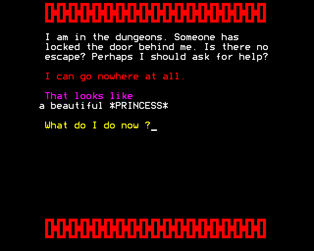 Go farther west and you’ll find the princess! Except now you are locked in, and typing HELP as the game suggests indicates that if you don’t have a key you should reset your game.