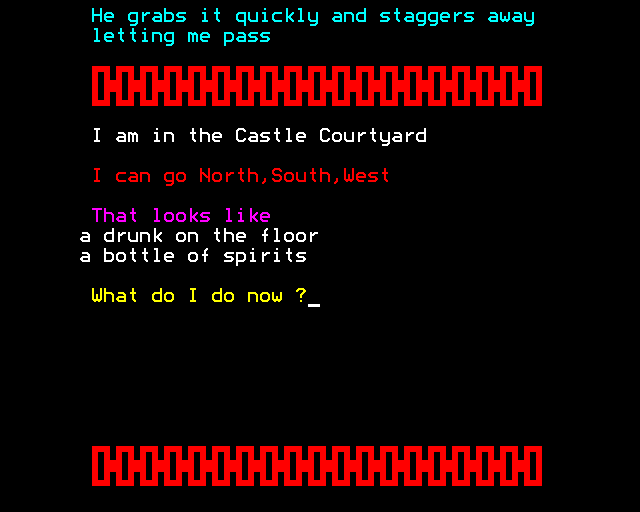 Moving on you can find a drawbridge (no puzzle, just PULL LEVER) followed by a “drunken man” in a Castle Courtyard that is blocking your way west (you can pass south unfettered). If you take the spirits from the kitchen and drop them he will helpfully pass out.