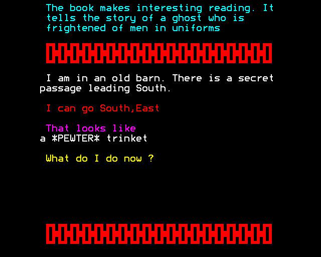 This leads to an Old Barn with a *PEWTER* trinket and a book of ghost stories, and just past is a tiny cave which appears to be empty. I tried to do SWEEP even though I had no appropriate item and the game told me I couldn’t swim. This is a two-letter parser. (On the BBC Micro, why!)
