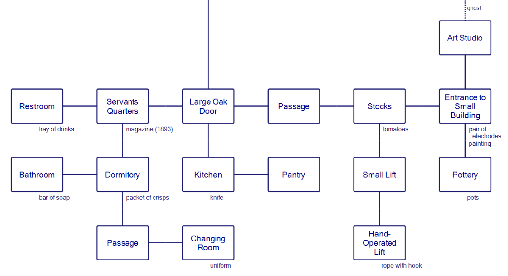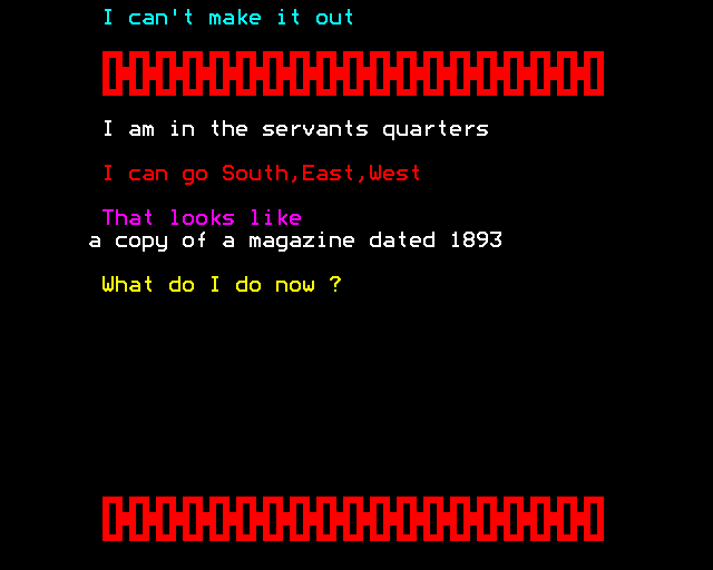 …you can do a sweep down various rooms to the south and west and find a sharp knife in a kitchen, a tray of drinks in a restroom, a bar of soap in a bathroom, a packet of crisps in a dormitory, and a uniform in a changing room. (You might think to WEAR UNIFORM while in that room, but there is no response to this.) There is cryptically also a “magazine dated 1893” where READ MAGAZINE gets the message “I can’t make it out.”