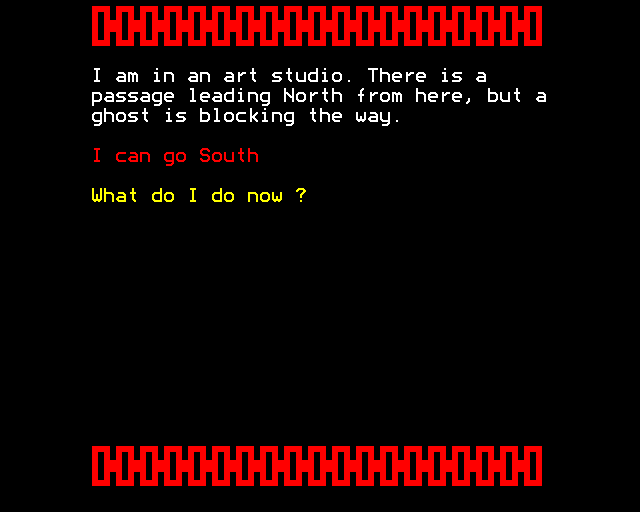 You might think, ah, the book says the uniform will scare ghosts, but I have not been able to wear the uniform, nor does it get used “passively”. I tried SCARE GHOST and since the game has a two-letter parser it read the command as SCORE instead, telling me I had 1 out of 7 points possible.