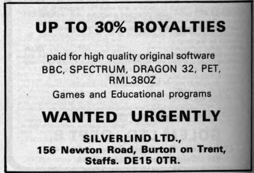 While the situation at Kidsgrove wasn’t quite as bad, they still went from 33,000 to 20,000 employees from 1981 to 1984. So it is possible Andrew Espeland was one of the redundancies; whatever happened, he decided to strike it out on his own as a software publisher in mid-1983 and founded Silverlind. He posted solicitations for authors during this time.