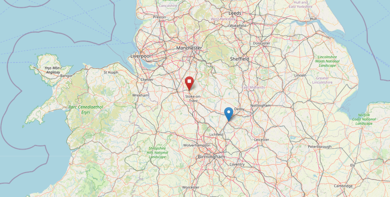 Two relevant places for today marked: Kidsgrove in red, Burton-Upon-Trent in blue to the southeast.