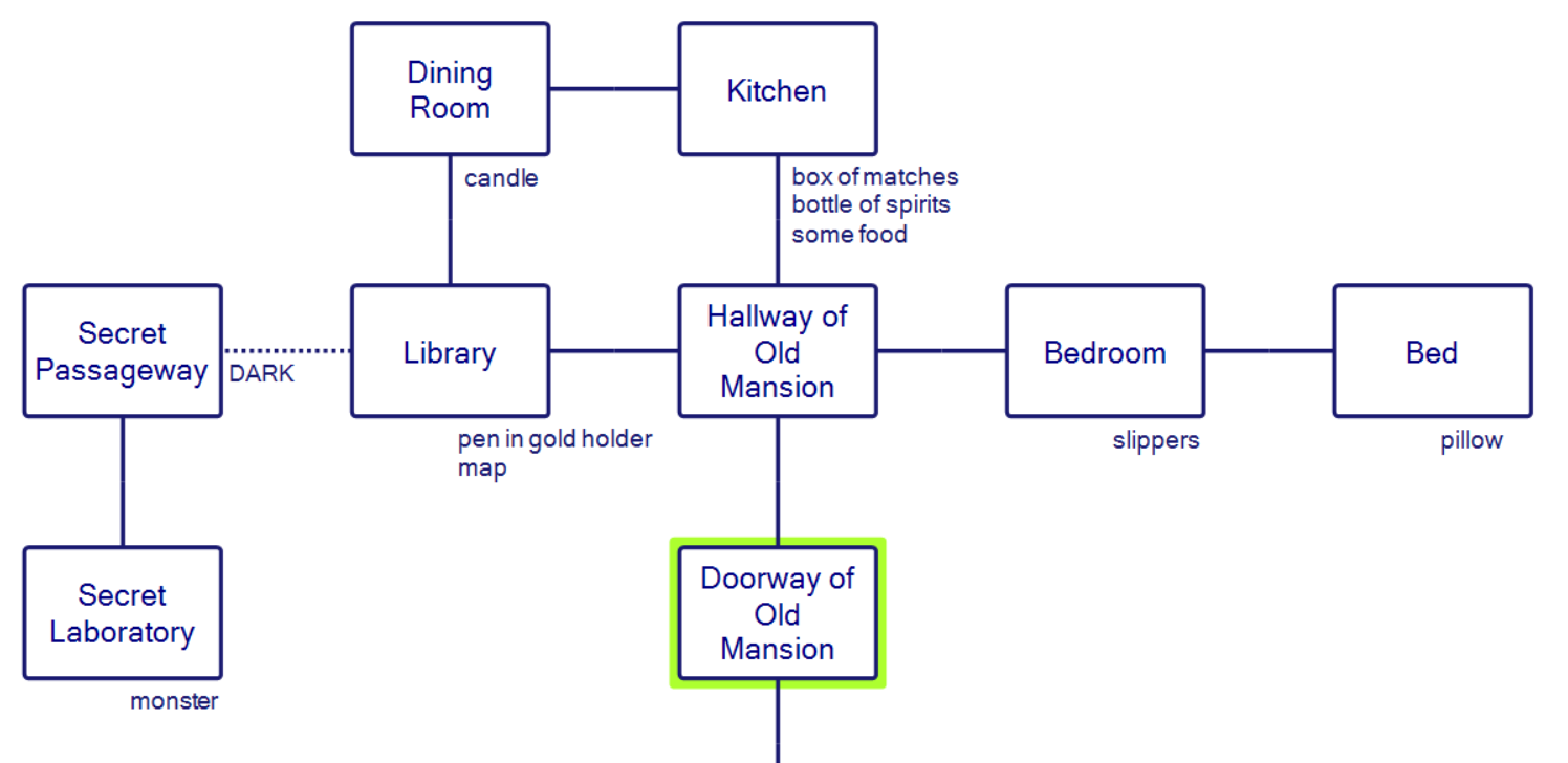 Doing a grand tour, east of the hallway is a bedroom with a pair of slippers, and “an old four poster bed” with a pillow. North leads to a kitchen with a box of matches, a bottle of spirits, and some food, and going west after leads to a “large dining room full of cobwebs” that contains a candle.
