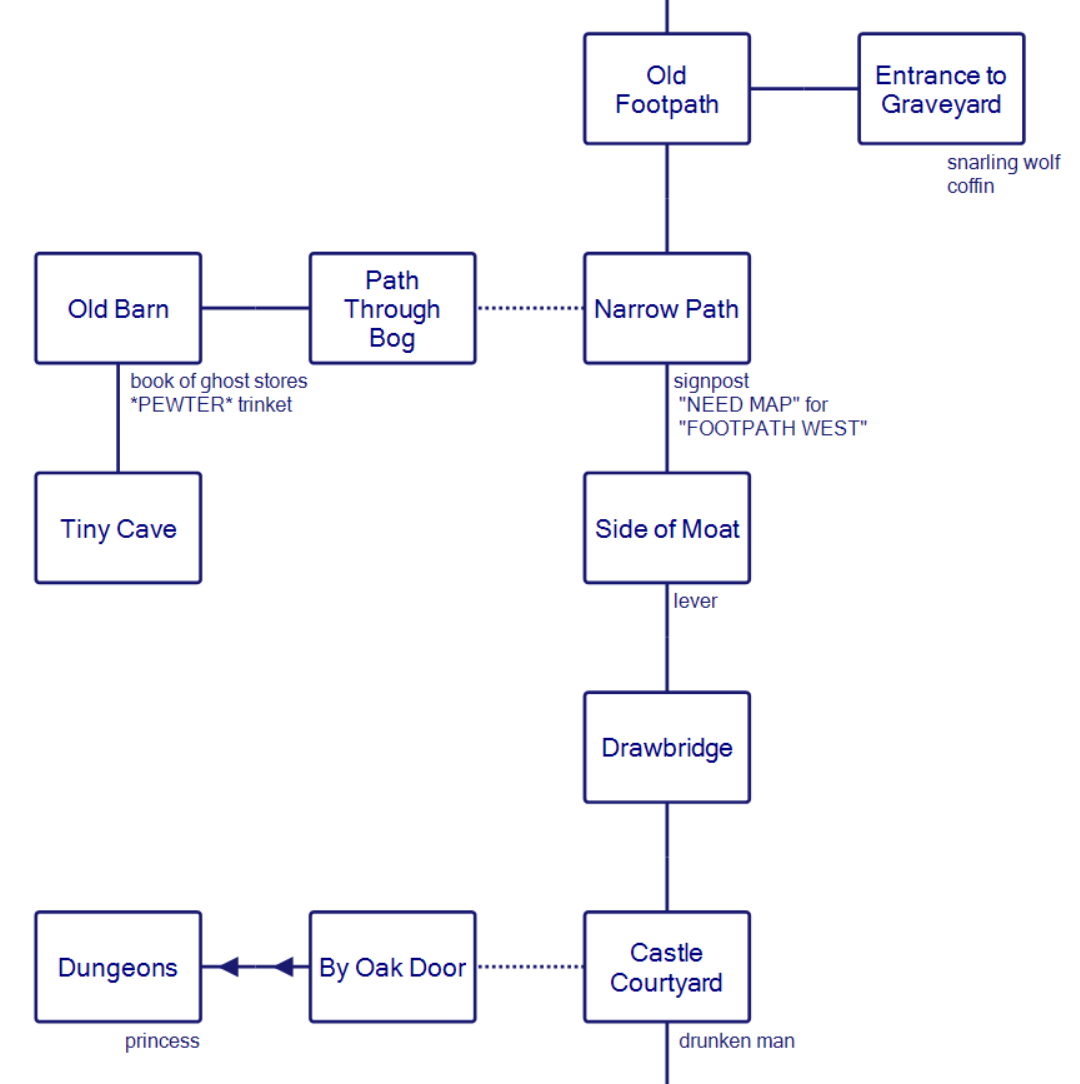 (I originally died while holding the map thinking it would be used passively. Not only can the map only be read in the right room, but you have to do the READ command before moving otherwise you’ll die.)