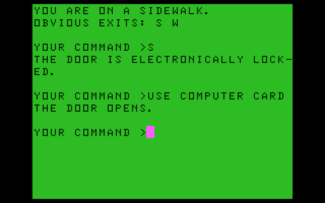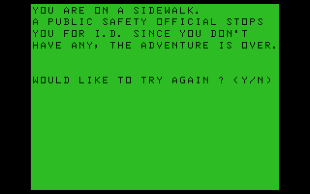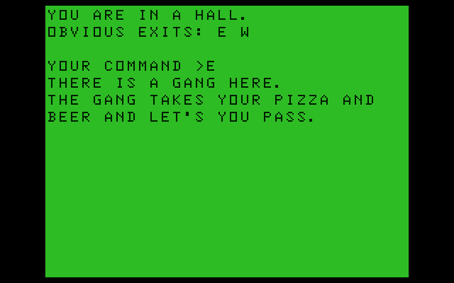 I get the impression the author was aiming for something a little more dense. The opening made me hopeful we were going to get a “my university” satire with lots of obscure references; that’s not a bad thing in this context because it means the author would be aiming at a particular target and trying to say something, even if that something is an observation on the overzealousness of campus patrol. However, they clearly gave up by the end and the red herrings start to feel more like parts of the game the author never finished with (potentially due to lack of memory space). The opening spiel to the T&D newsletter for this issue even says