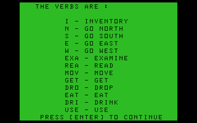 The verb list is unusual in that only the first three letters from the applicable verbs can be used. That is, from the starting room…