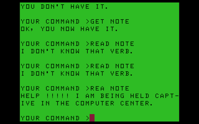 …and you can type GET NOTE just fine, in order to read it you must type REA NOTE, not READ NOTE. I’ve never seen this particular piece of jank before, indicating this is an author we haven’t met yet.