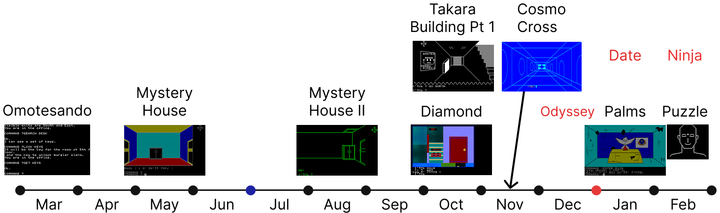 On my timeline of early Japanese adventure games, this technically lands somewhere in November of 1982, as the earliest ad that Rob found was in December of 1982.