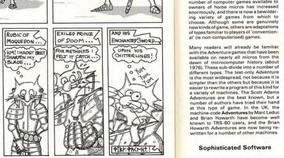 Many readers will already be familiar with the Adventure games that have been available on nearly all micros from the dawn of microcomputer history (about 1976). These sub-divide into a number of different types. The text-only Adventure is the most widespread, not because it is simpler than the others but because it is easier to rewrite a program of this kind for a variety of machines. The Scott Adams Adventures are the best known, but a number of authors have tried their hand at this type of game. In the UK, the machine-code Adventures by Marc Leduc and Brian Howarth have become well known to TRS-80 users, and the Brian Howarth Adventures are now being rewritten for a number of other machines.