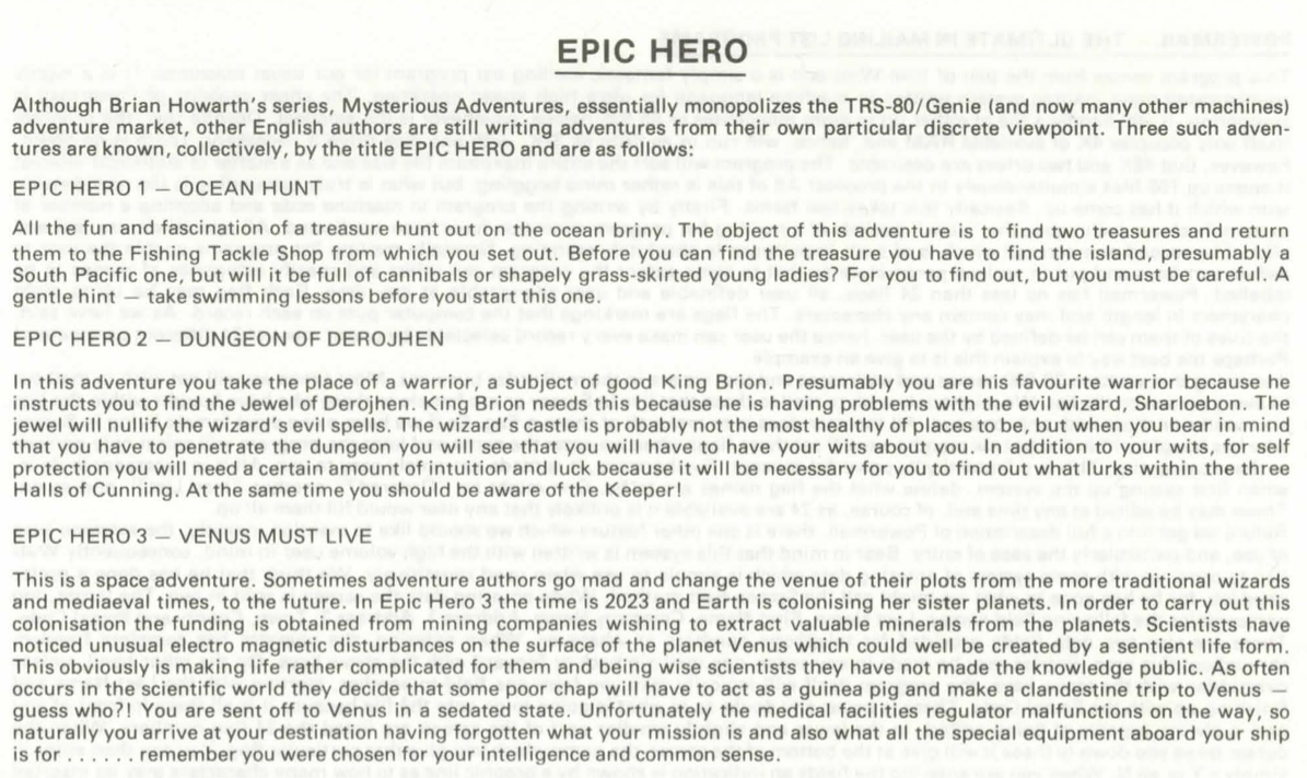 “Although Brian Howarth’s series, Mysterious Adventures, essentially monopolizes the TRS-80/Genie (and now many other machines) adventure market, other English authors are still writing adventures from their own particular discrete viewpoint.” In other words: I know who my best-selling author is, but have you considered buying an adventure game from a different author?