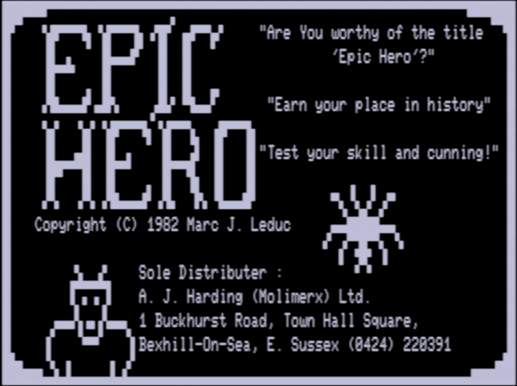 A December 1982 catalog does not contain the game so it appears to not have been officially published until sometime in 1983, but awkwardly, not only did Leduc finish all three Epic Hero games with a copyright of 1982, he started his new Colour Genie series in 1982 as well. Especially given the role clubs played during this era in distribution (with “libraries” of games for sharing), I think it likely Epic Hero made it out at least to the local Nottingham area before being published; adding on the fact the Colour Genie games ended up more-or-less self-published, is a date of 1982 or 1983 more appropriate? (CASA uses 1983.) I’m listing both in the title but sorting in 1983 for now, but it’s possible some issue of LPRINT will emerge that throws this for a loop (I haven’t been able to find any copies).