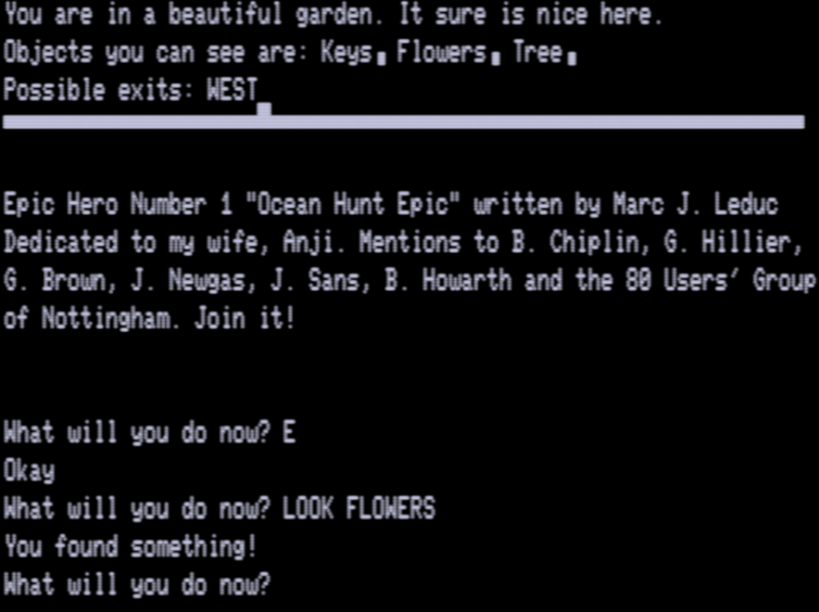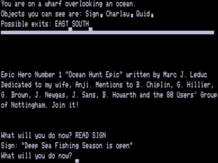 Brian Howarth we’ve now seen quite a few times now (with games like The Arrow of Death and Circus); he’s given enough direct interviews that his history is mostly well-understood. (The exact story behind him switching to using the Scott Adams database format for his games is still messy, but at least we know enough about him for there to be a historical riddle in the first place.) Marc Leduc, mentioned in the same sentence, has not yet had any coverage here at all, and he’s had very little attention from modern writers.
