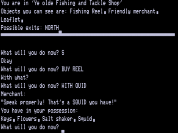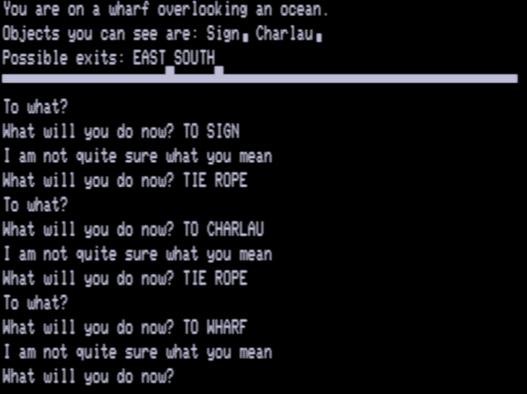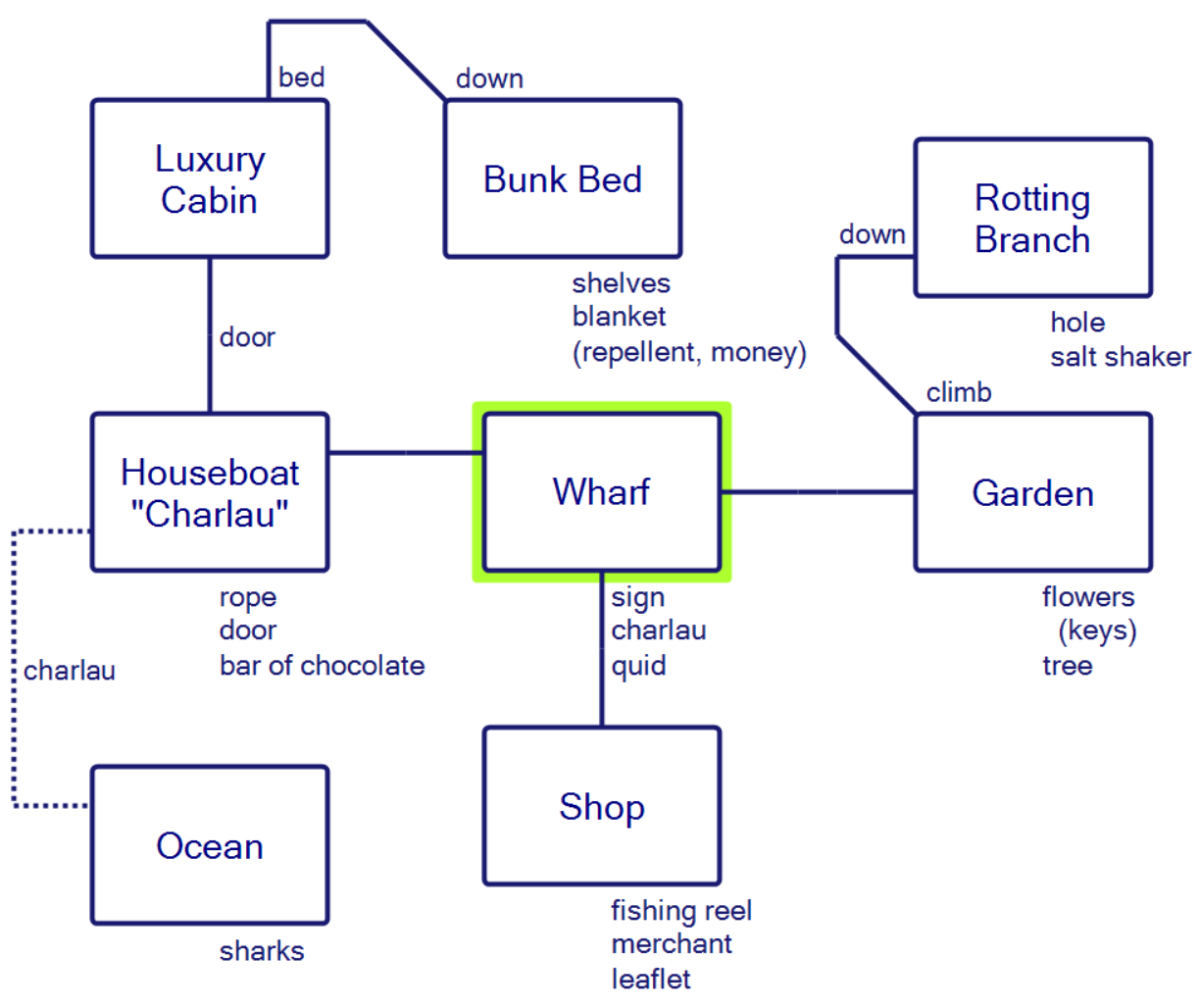 I would assume the rope could be used to tie the boat to the wharf, but I’ve tried TIE ROPE / WITH NOUN on every feasible noun both on the boat and on the wharf. I’m not sure what’s going on. The money presumably should be used to buy the reel before we take off for the ocean.