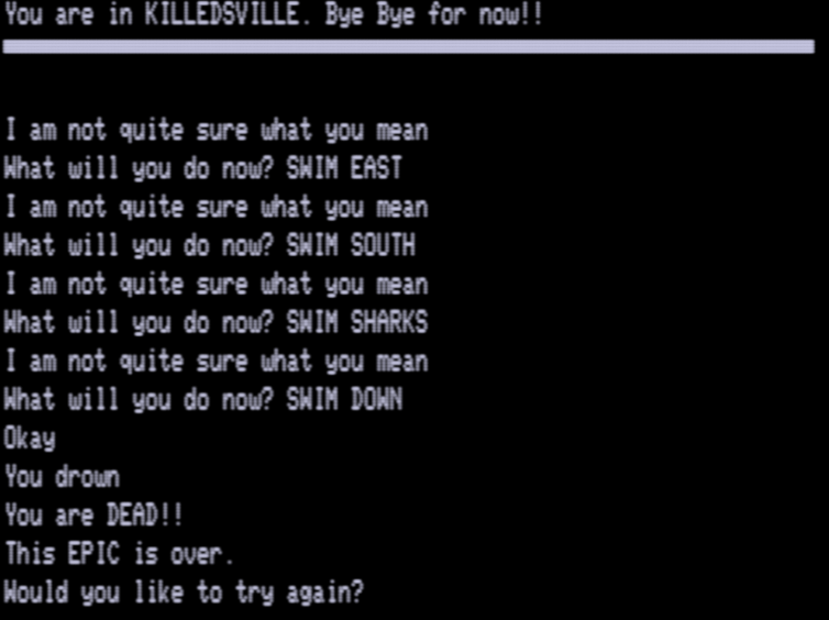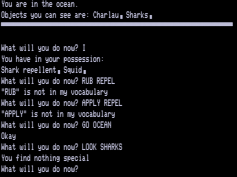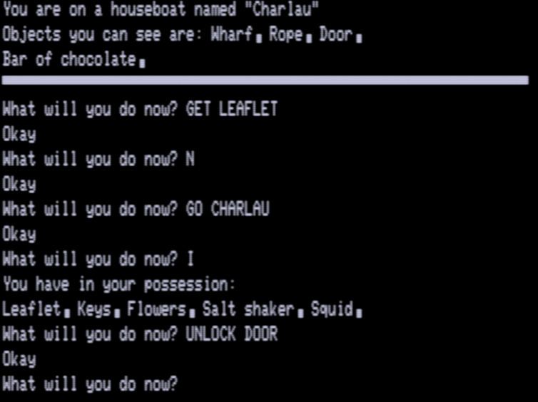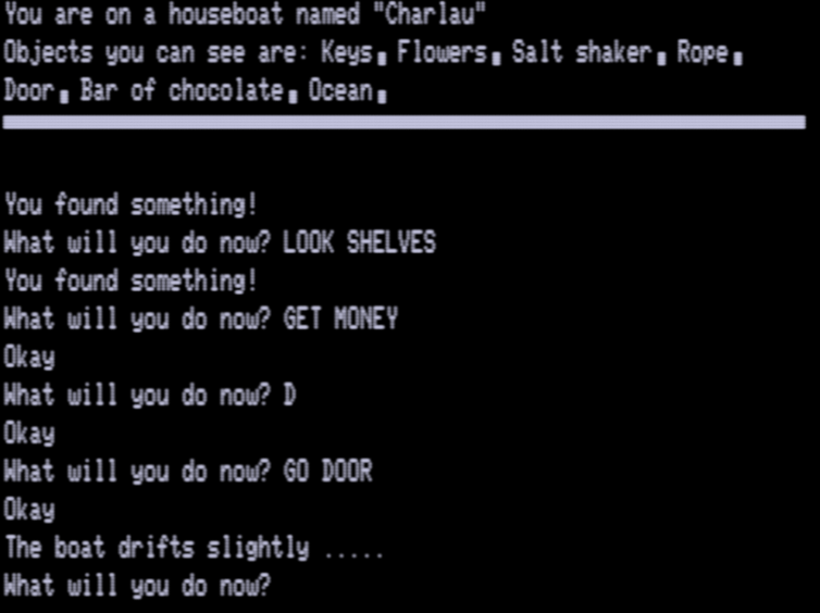 I think I need pull out the bigger guns on this parser to make any progress. If all else fails, there is a walkthrough, but this is the only Leduc game out of his nine that has one, so it’s better for me to try to figure out his mindset as much as possible now while I still have a fallback. Everything is in machine code so I can’t just expect to prod at BASIC source code on his later games.