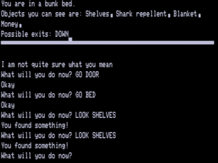 Inside you can climb up to a bed and find shelves with some sharp repellent and some money (as long as you LOOK SHELVES more than once, but that’s pretty standard for this era).
