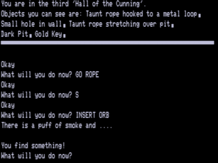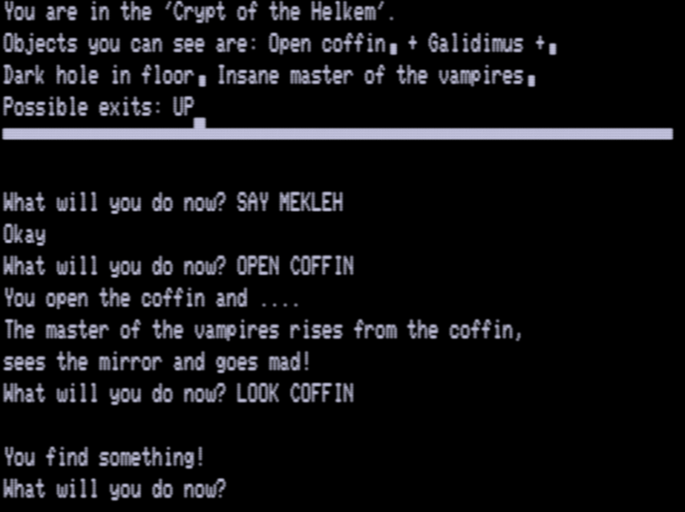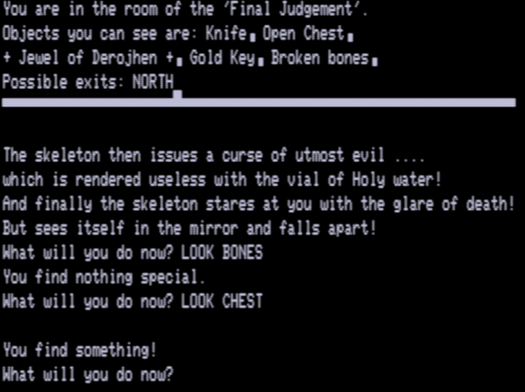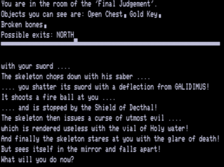 It’s not exactly the same; it uses scimitars rather than a saber, but it is resistant to bladed attack (like this game implied), and holy water is useful in both incarnations (as you’ll see in a moment). For this game’s version, you need a set of objects to fend off a series of attacks: saber, fireball, curse, and finally death gaze. It’s a little like the Babel Fish puzzle of Hitchhiker’s but with everything done in one shot. This has the downside it is easy to beat by accident, but the inventory limit means you probably dropped one of the important items before arriving here.