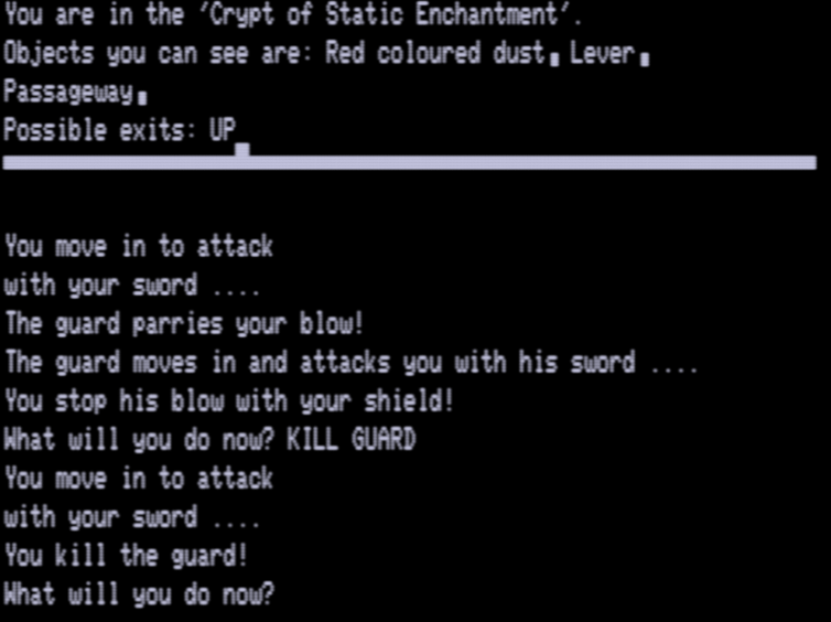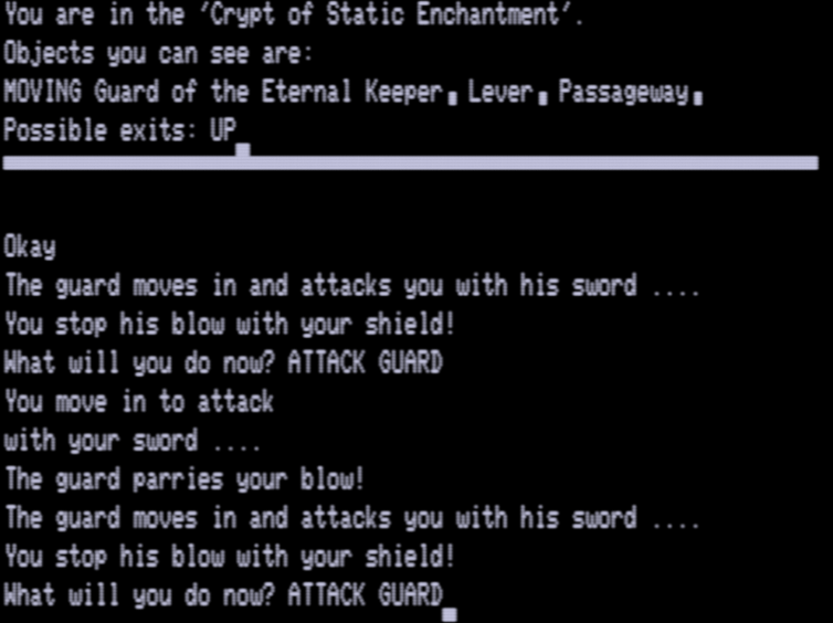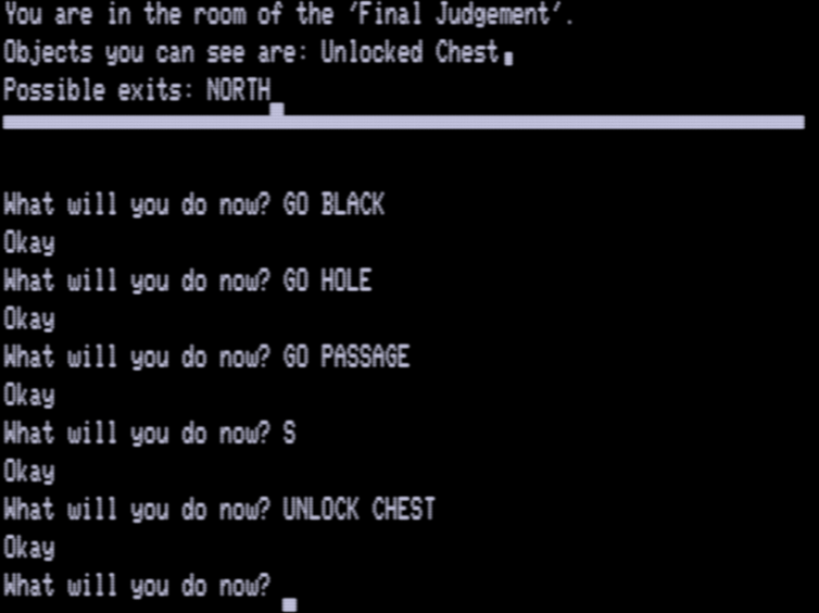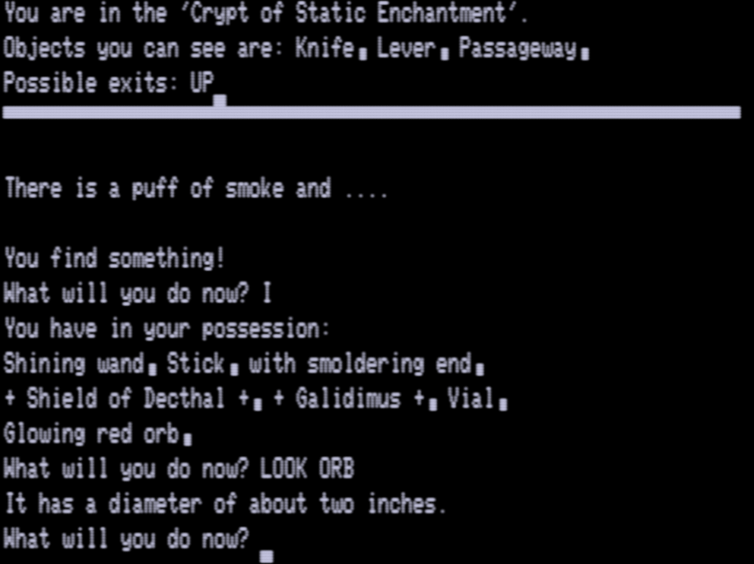 This compares quite favorably to the Howarth games (I think Arrow of Death Part 2 was a little better due to clever geography design, and it’s on par with The Time Machine). Scott Adams still inches above with clever use of daemons which doesn’t happen here; there are no persistent effects (like rooms that change over time) to deal with or coordinate. However, given this is still only game number 2 from Leduc we may still see something like that in the future.