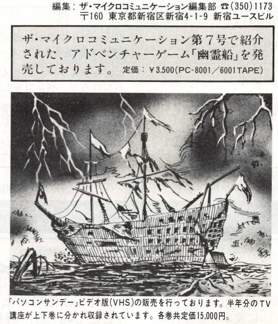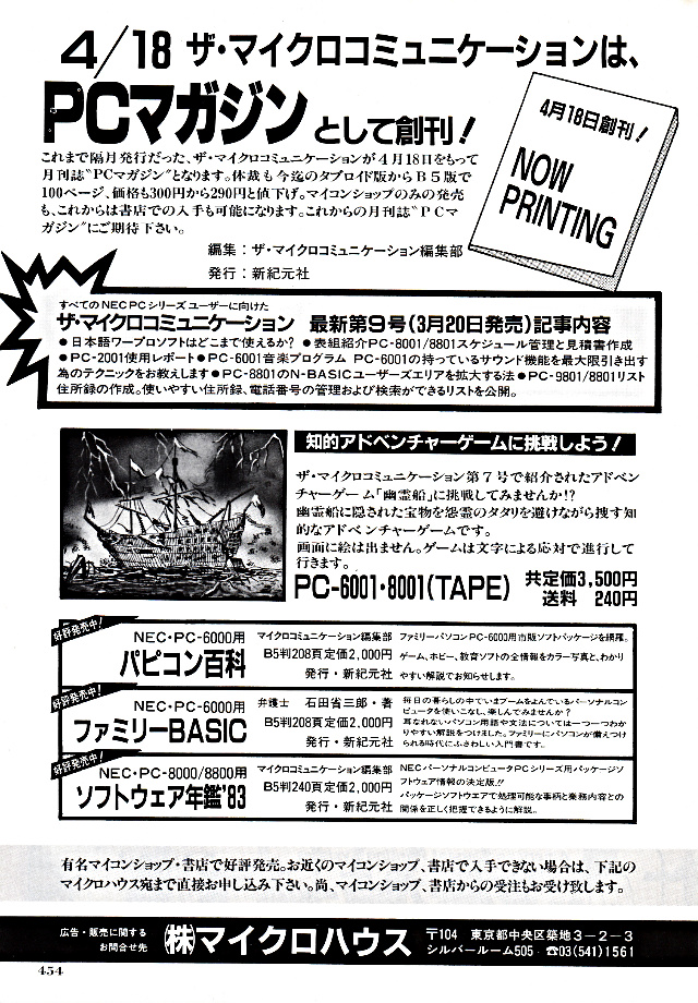 From the ad above — selling the game on tape, prior to PC Magazine launching — the publisher of the upcoming magazine is listed as Shinkigensha and the creator is listed as The Micro Communication, with a different address than Shinkigensha’s listed on the bottom. This doesn’t mean they were actually fully separate; they may have been essentially an informal spinoff that got pulled into the fold once the incorporation became official (exactly the month of the ad).