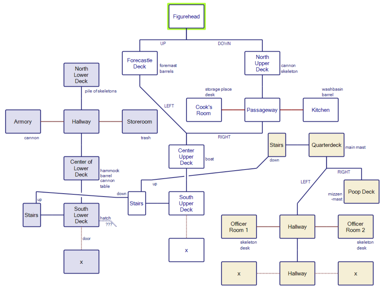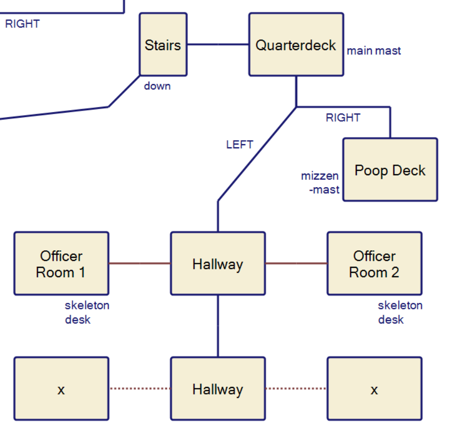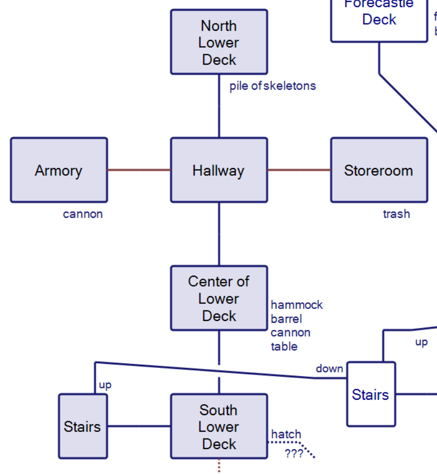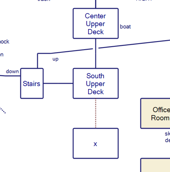 One last observation, this time on the main deck: there’s a boat in the center. One could presumably try to enter it and escape, and I tried to do that, but the game asked where I was going. Poking around the source code, there seems to be a map somewhere, so my suspicion is I need the map in hand first before escaping.