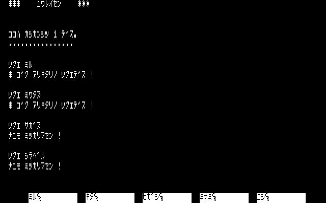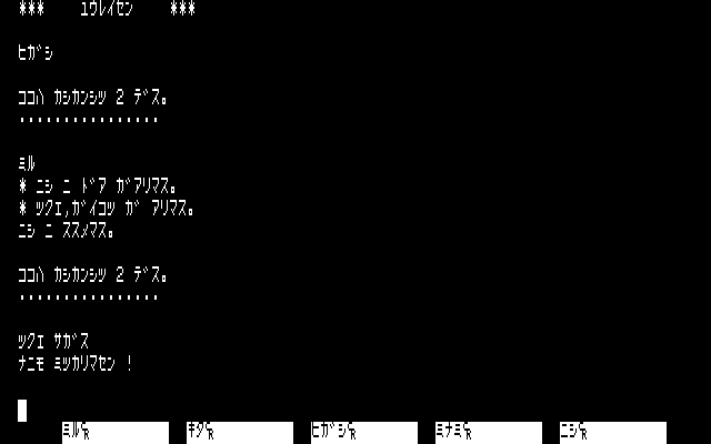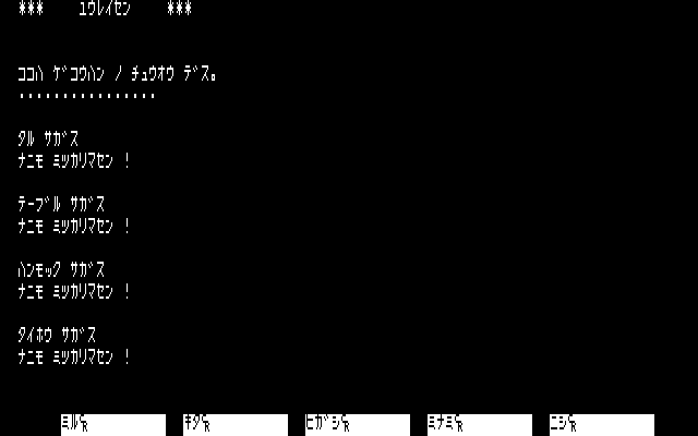 When applied to a noun instead, miru and miwatsu seem to function like EXAMINE, and sagasu and shiraberu seem to function like SEARCH (assuming a parser with a split where SEARCH involves a more active looking process). The screenshot below involves checking a desk four times; miru and miwatsu call it “ordinary”, while sagasu and shiraberu state that nothing is found, implying a search by hand.