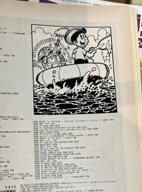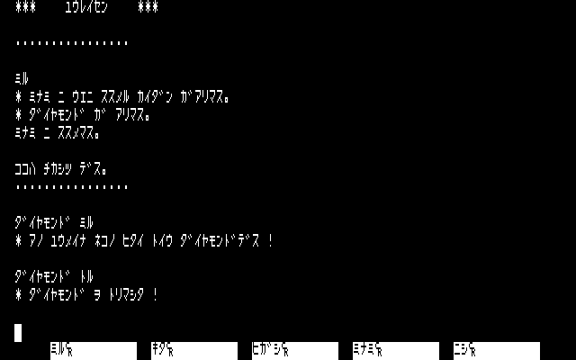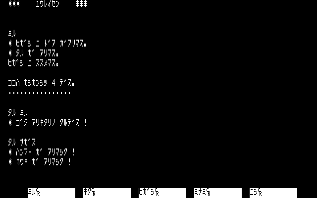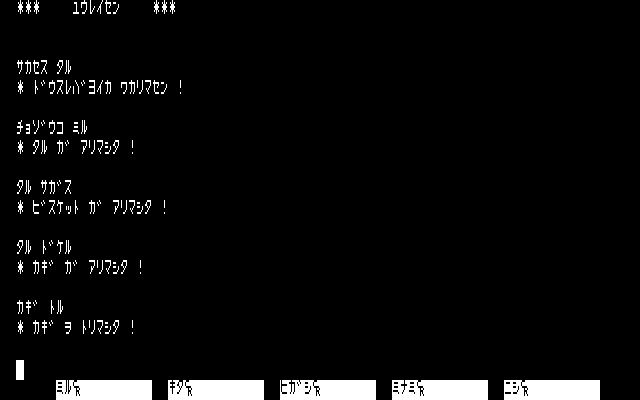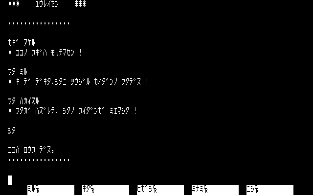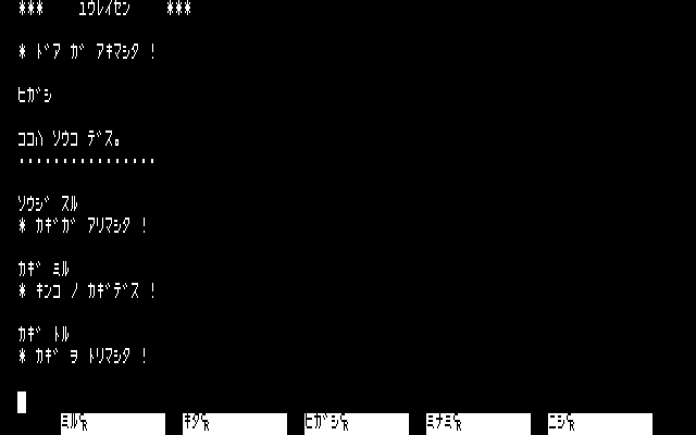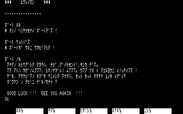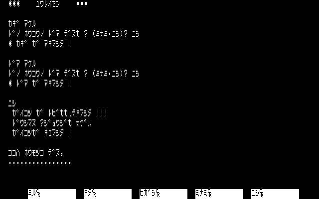 Conceptually, I found it interesting to have the game’s emphasis be on atmosphere and have the puzzles all essentially be optional. In practice, the endless barrels and tables and so forth that needed to be examined blurred together, and while keys were technically marked with where they went, there wasn’t a way to tell in most cases until after unlocking the doors in question! (That is, if you know a key goes to the captain’s quarters, but not which door that is, that’s not helpful information.) Still, this was fairly deep for a type-in, and of course the author was working essentially without precedent; there were no other text-only games written in Japanese to refer to.